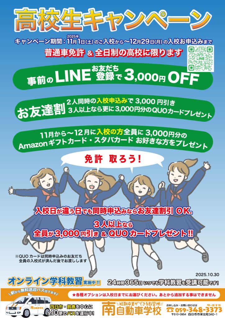 《高校生キャンペーン》【キャンペーン期間:2025年 11/1のご入校から〜12/29(月)の入校お申し込みまで】